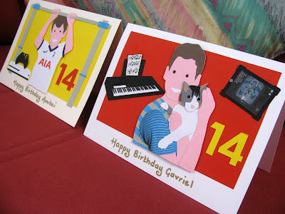 Amitai is a big Tottenham Hotspur supporter, so mum asked if I could show him wearing his new Spurs shirt (Tottenham Hotspur Football Club are commonly referred to as Spurs), while doing pull-ups for exercise in the park. He also likes playing on his Xbox, so I included that on the card as well. A big number 14 marks his age.
